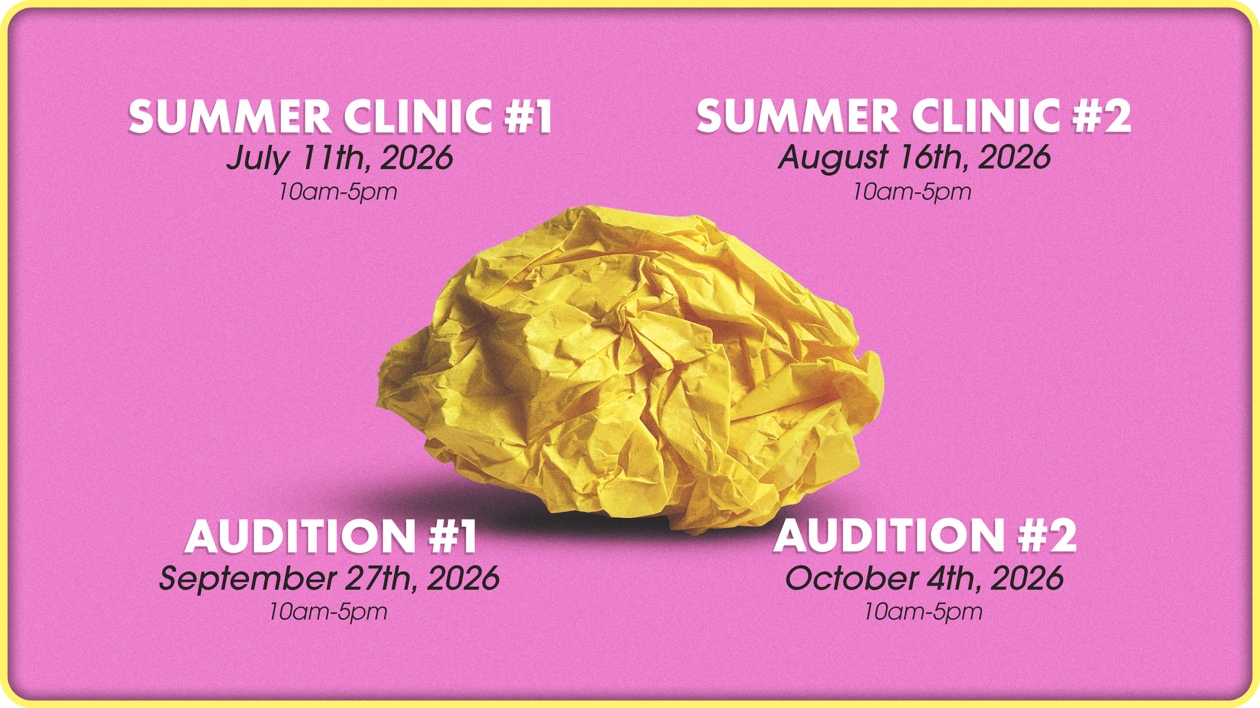 Below are the dates and times for our summer clinics and auditions for the 2027 season…